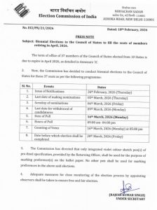 भारत निर्वाचन आयोग ने अप्रैल 2026 में सेवानिवृत्त होने वाले राज्यसभा सदस्यों की रिक्त होने वाली सीटों को भरने के लिए द्विवार्षिक चुनाव कार्यक्रम की घोषणा कर दी है। आयोग द्वारा जारी प्रेस नोट के अनुसार कुल 37 सीटों पर चुनाव कराया जाएगा।