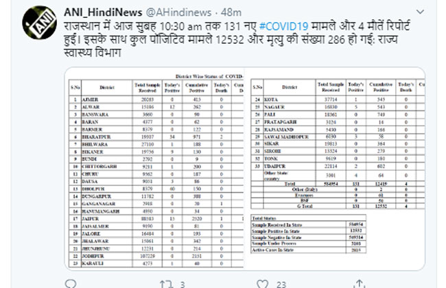 Rajasthan COVID-19 : प्रदेश में अब तक 12,532 पॉजिटिव केस मिलने के साथ ही 286 लोगों की मौत